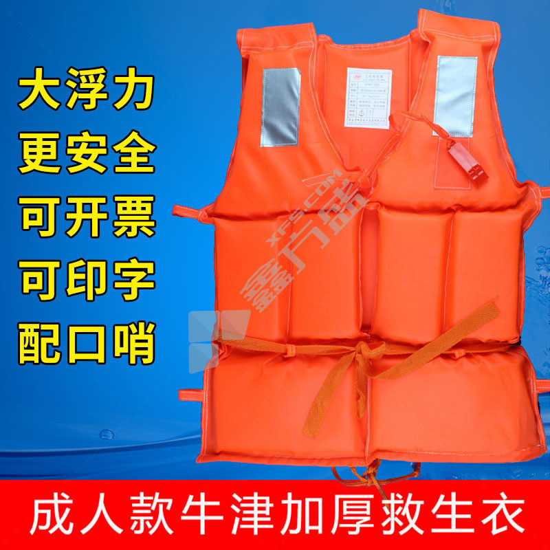 1.海用救生衣:也是我们用的最多的一种,他内部采用EVA发泡素材,经过压缩3D立体成型,其厚度为4厘米左右(国内产的是5-6片薄发材料,厚约5-7厘米),按照标准规格生产的救生衣,都有它的浮力标准,一般成年为7.5千克/24小时,也就是说成年人穿上它浸于海中24小时后其浮力仍可以达到7.5千克。