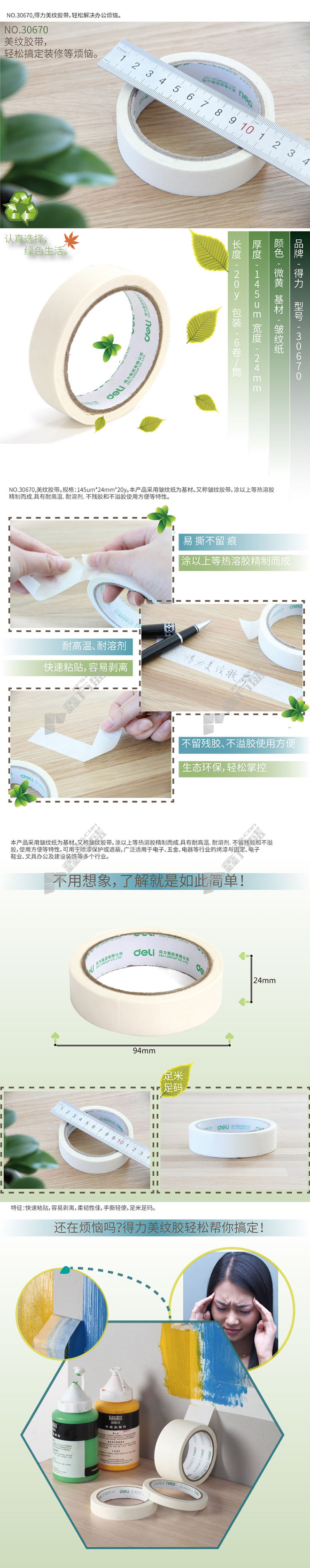 商品名称: 得力 deli 微黄美纹纸胶带 30670 24mm*20y 145μm 白色