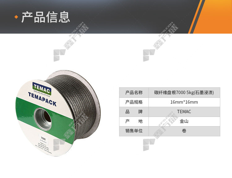 商品名称: 太美/TEMAC 碳纤维盘根7000 5kg 石墨浸渍 7000,16*16mm 5KG/卷