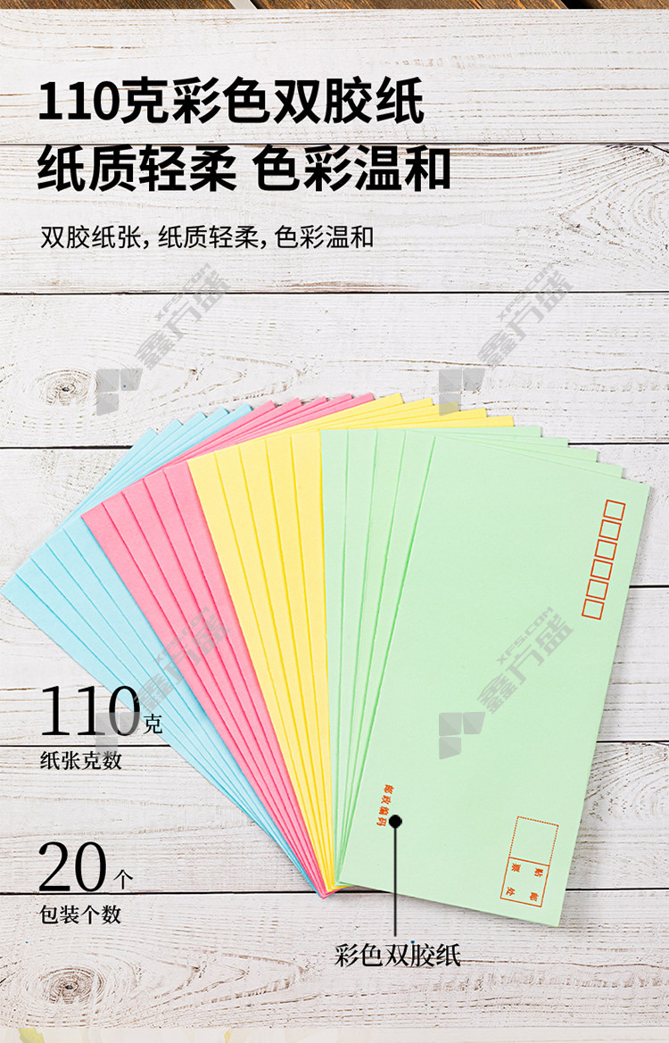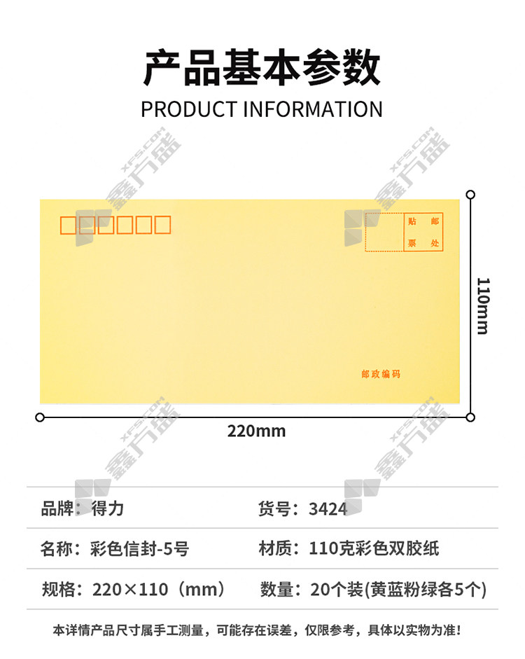 商品名称: 得力 3424 5号信封 220*110mm 彩色 20个/包