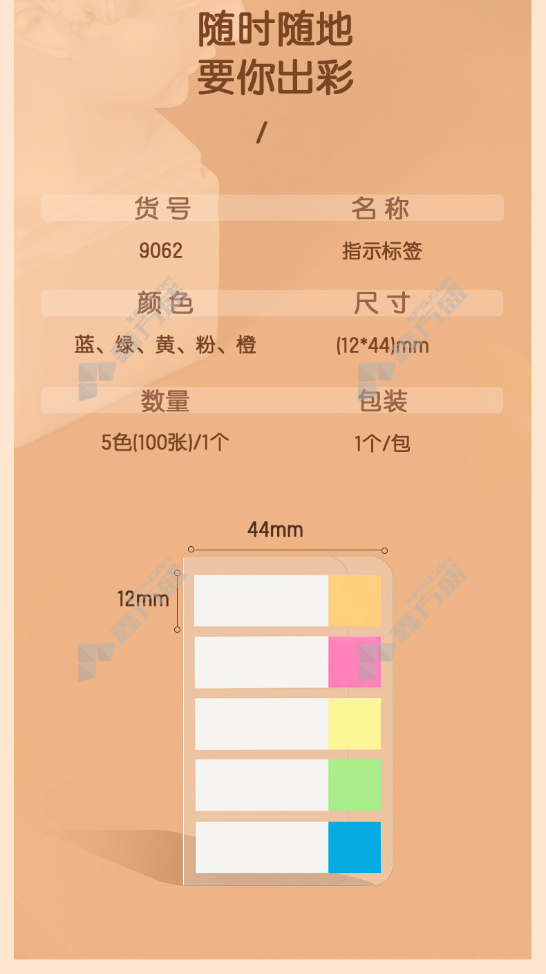 商品名称: 得力 9062 指示标签 44*12mm 20张*5条 黄色 蓝色 粉色 绿色 橙色
