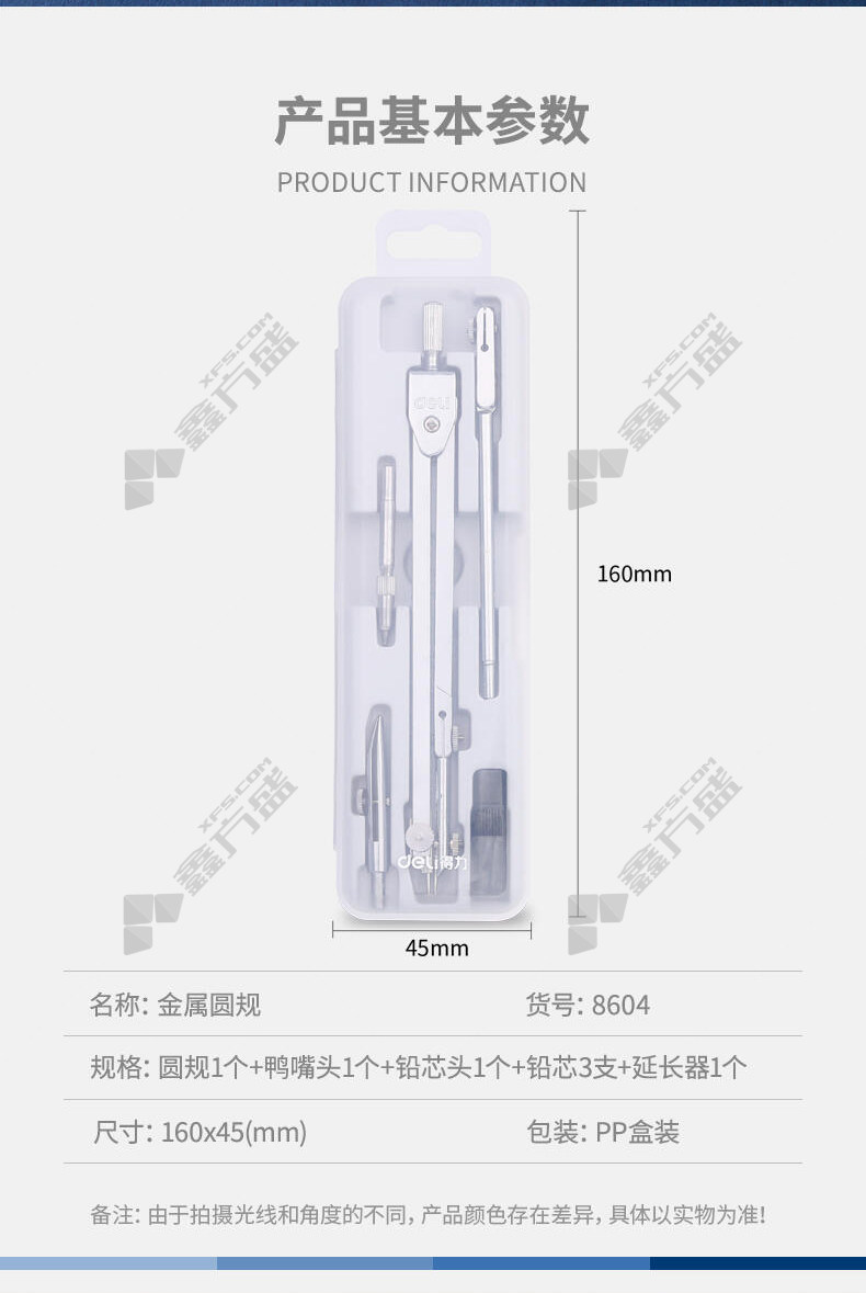 包装清单:圆规*1个、鸭嘴头*1个、铅芯头*2个、HB铅芯*3支、延长器*1个