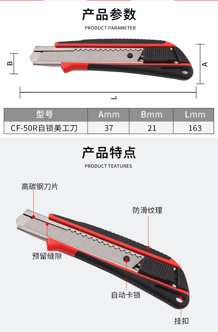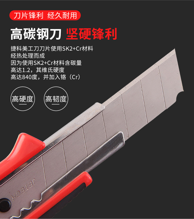商品名称: 捷科 18mm自锁式包胶美工刀 7节 18*100mm CF-50R/130152