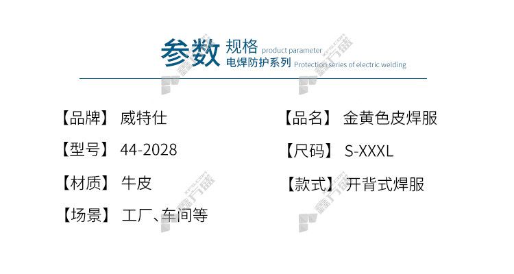 商品名称: 威特仕 44-2028 耐磨隔热抗火开背式焊服 XL 44-2028 金黄色