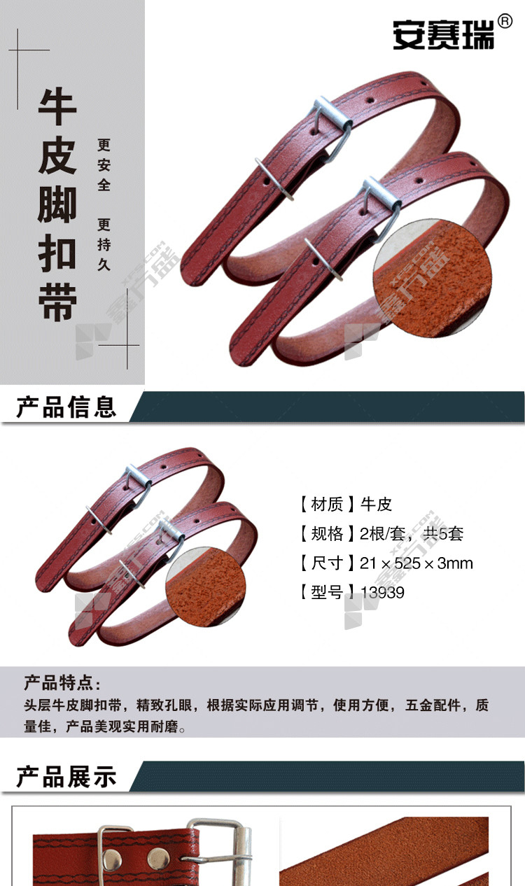 商品名称: 安赛瑞 13939 10条装电工牛皮脚扣带 21*525*3mm 13939