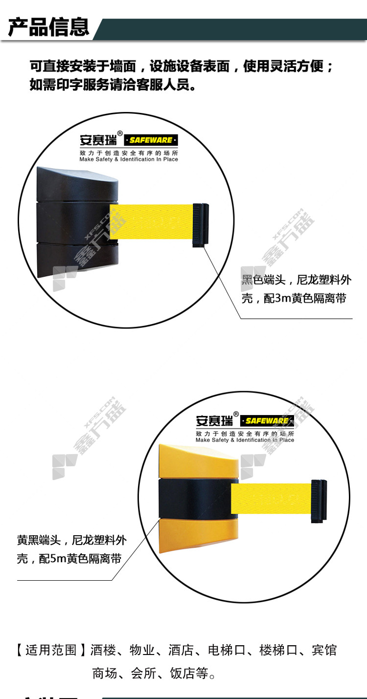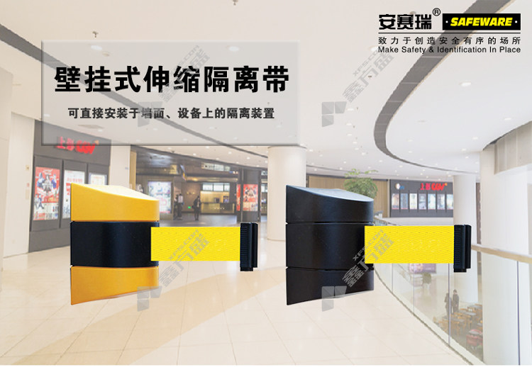 • 安赛瑞 11216 5M壁挂式伸缩隔离带头 长5m 黄色佩带 11216