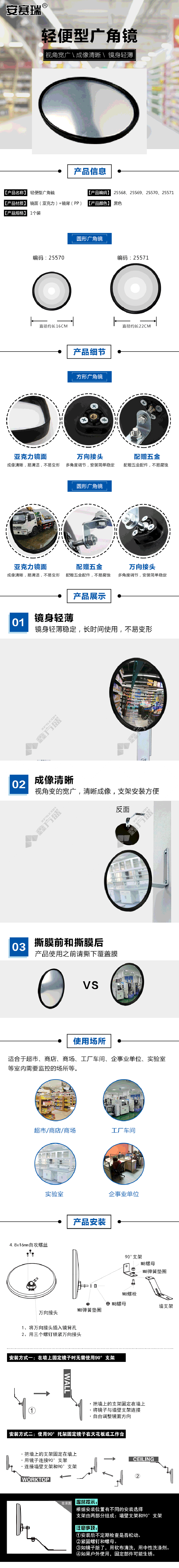 商品名称: 安赛瑞 25571 轻便型圆形广角镜 Φ22cm 25571