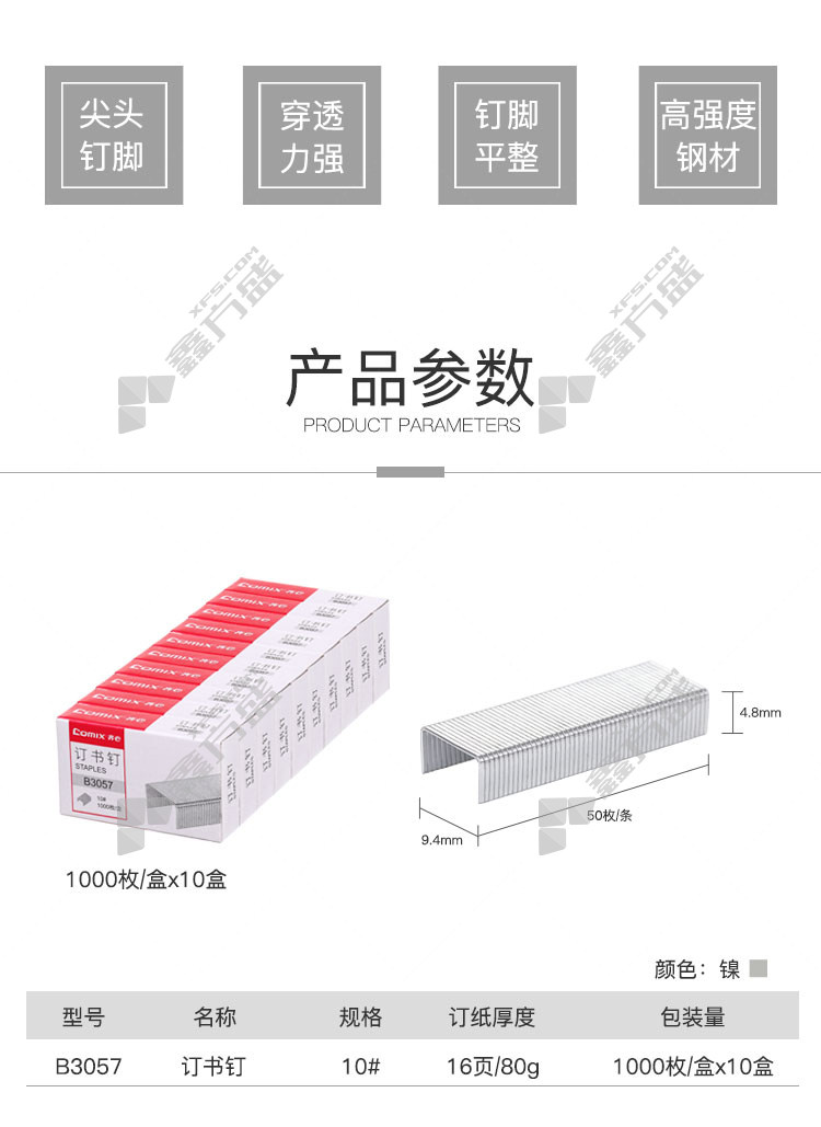 商品名称: 齐心 B3057 订书钉 10# 16页 1000枚/盒