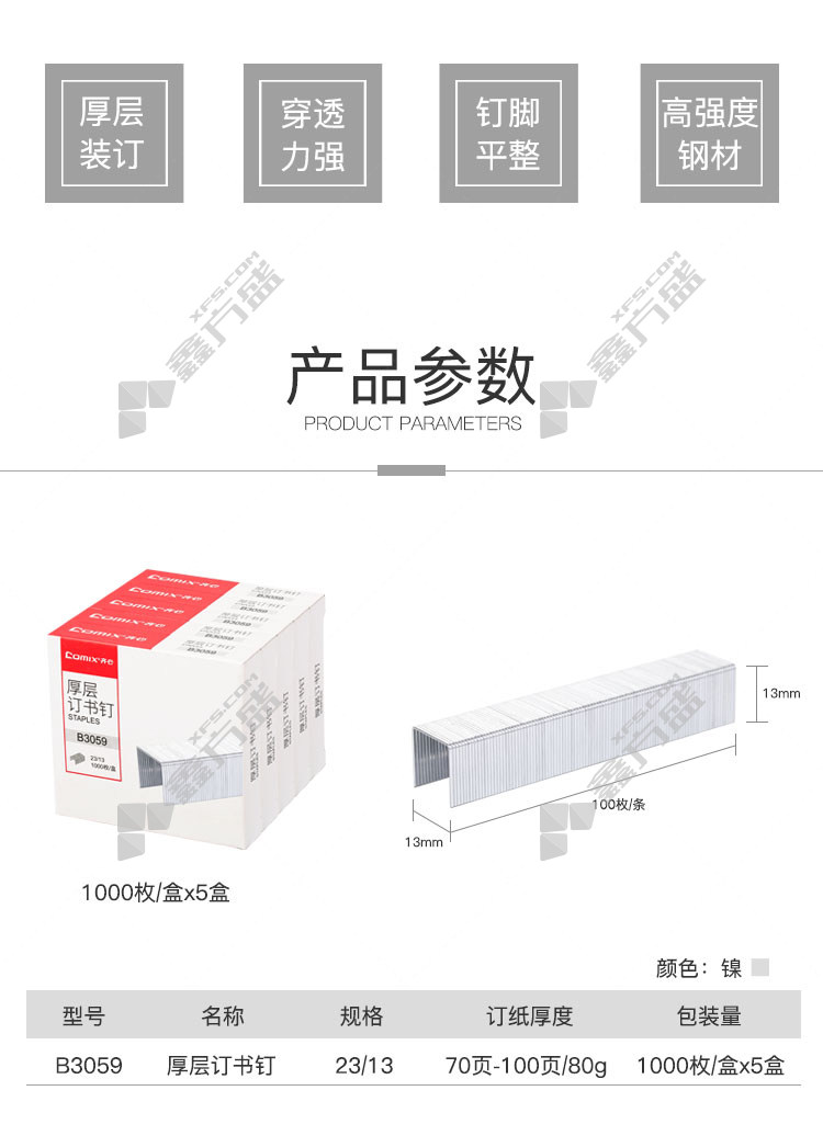 商品名称: 齐心 B3059 厚层订书钉 23/13 100页 1000枚/盒