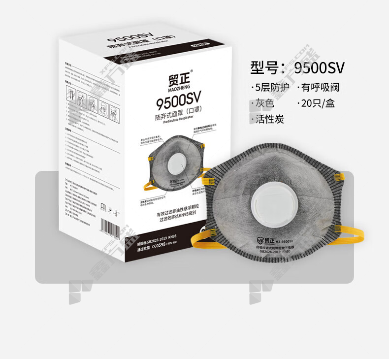 商品名称: 贸正 9500SV 杯状KN95带阀活性炭防护口罩 灰色 头戴式 20只/盒