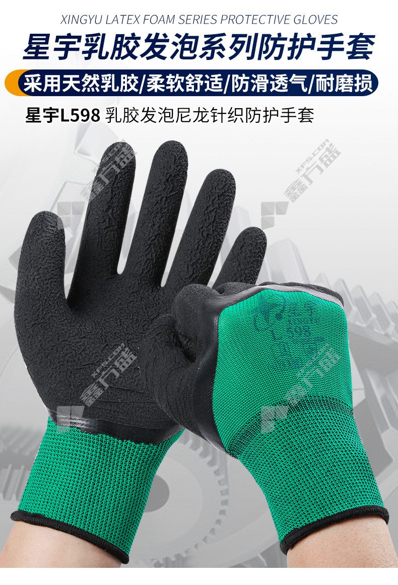 星宇 L598 乳胶发泡皱纹半浸手套 8码/M码 绿纱黑胶