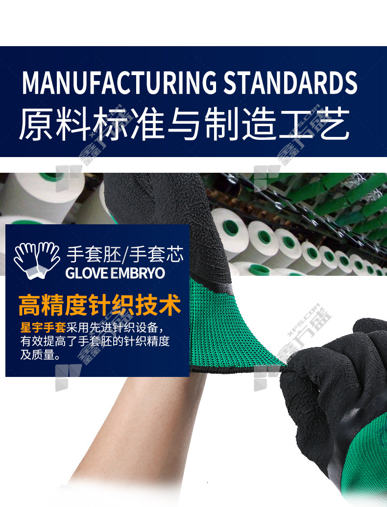 • 星宇 L598 乳胶发泡皱纹半浸手套 8码/M码 绿纱黑胶