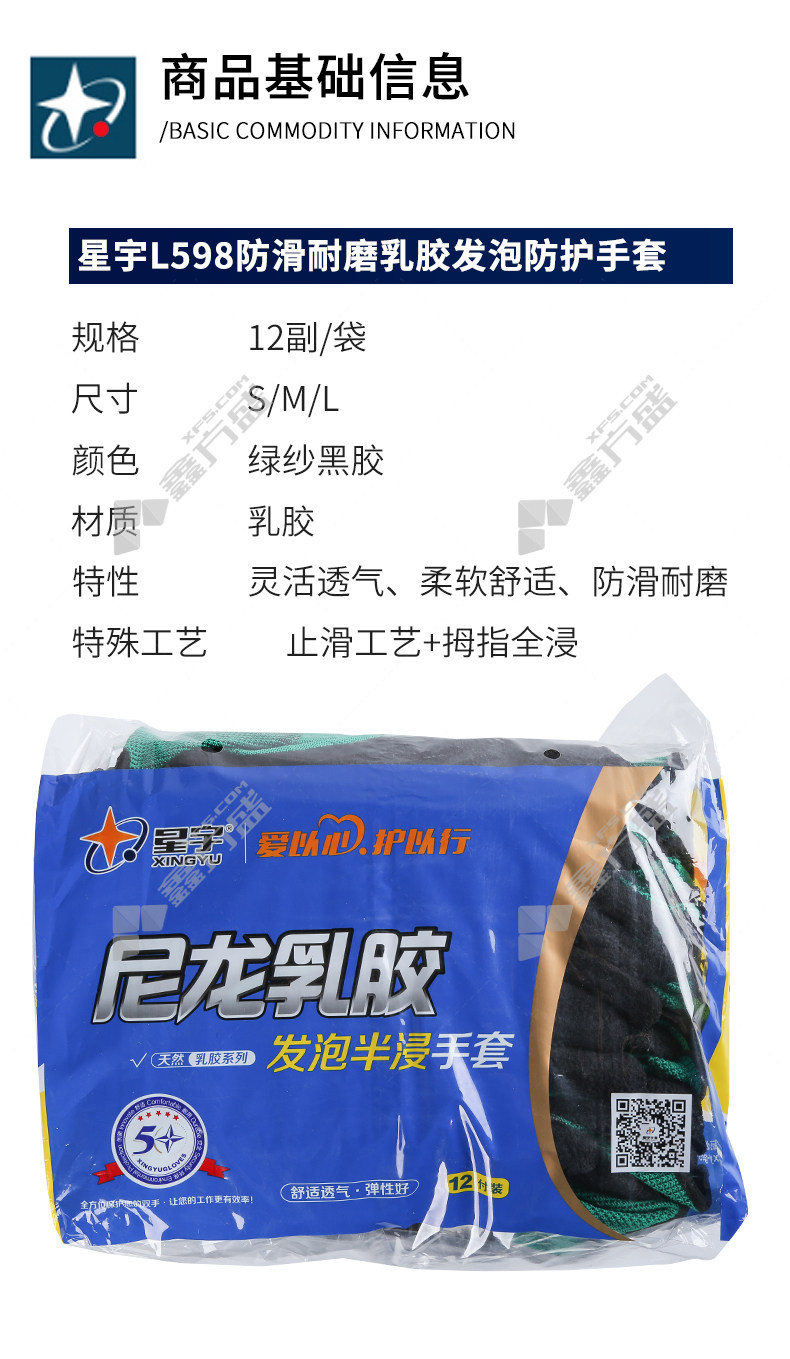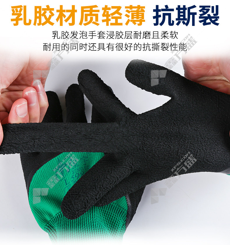 商品名称: 星宇 L598 乳胶发泡皱纹半浸手套 8码/M码 绿纱黑胶