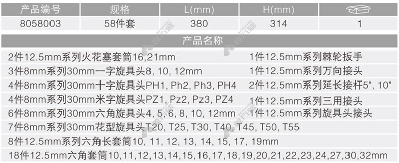 商品名称: 卡尔/KAER 58件12.5mm系列套筒组套 58件 8058003