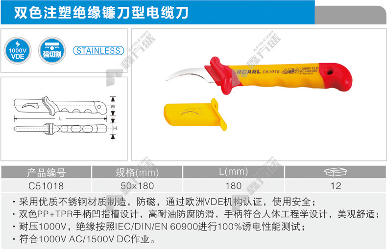 商品名称: 卡尔 镰刀型双色注塑绝缘电缆刀 C51018 50*180mm