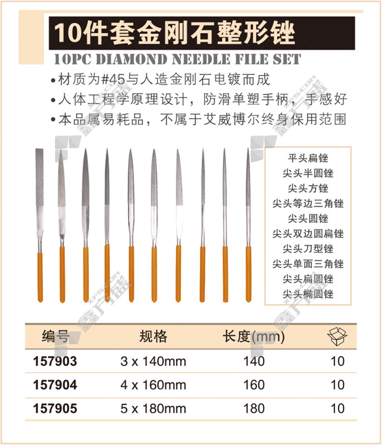 商品名称: 艾威博尔 10件套金刚石整形锉 整形锉 157904 4*160mm