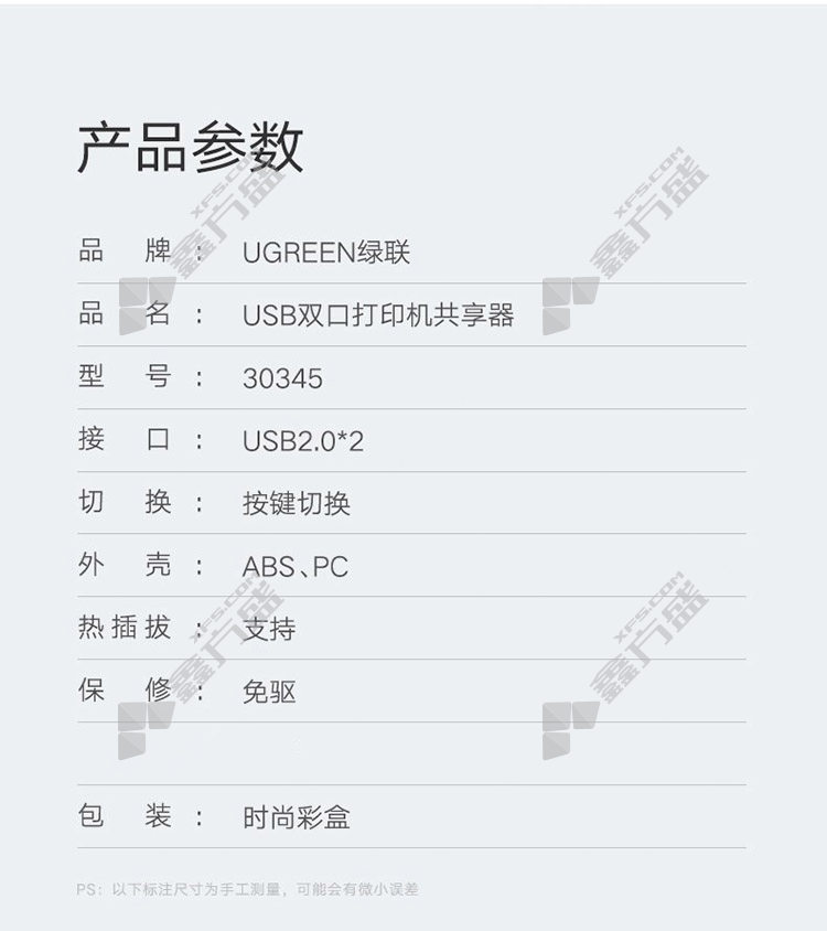 商品名称: 绿联UGREEN USB打印机共享器30345 30345 二进一出 2口 黑