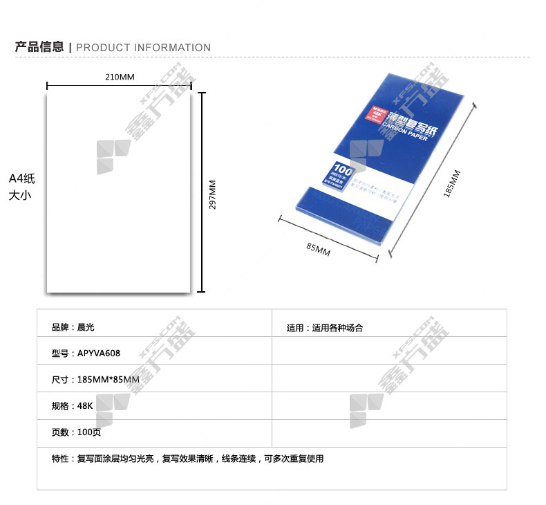 商品名称: 晨光 APYVF608 复写纸 12K 210*330mm 100页 APYVF608