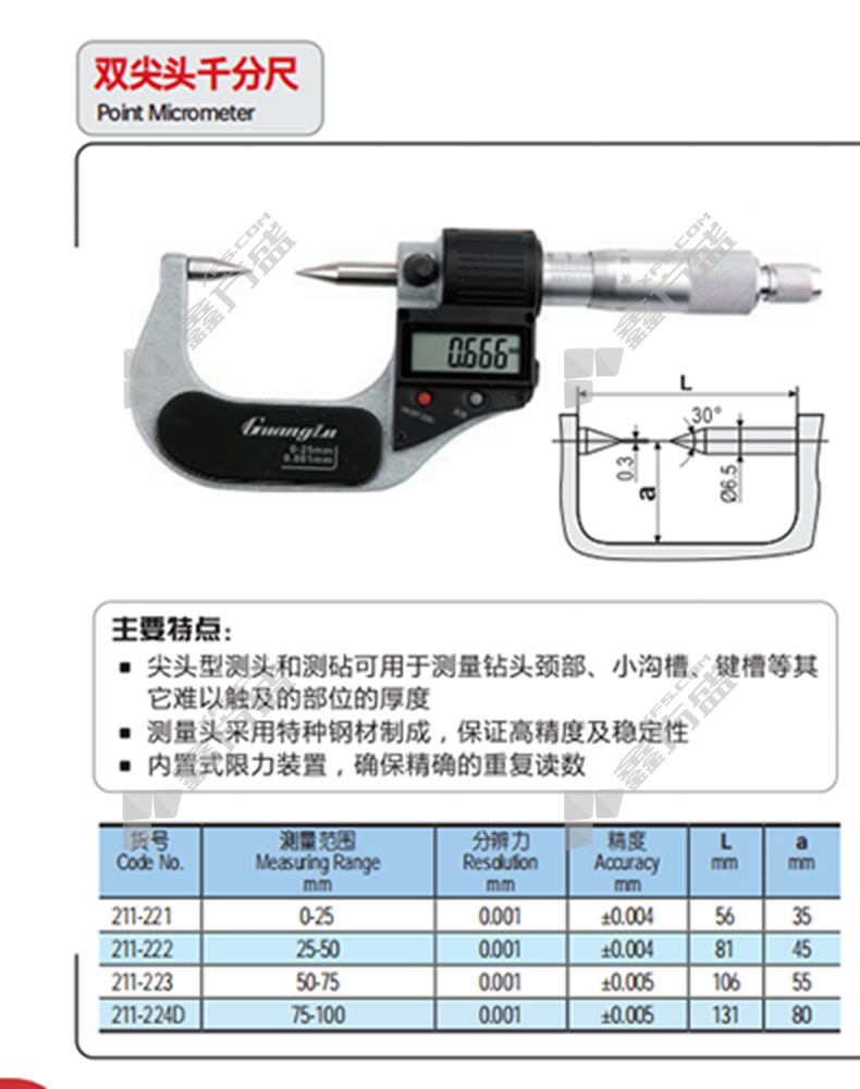 商品名称: 广陆 数显双尖头千分尺 50-75mm ±0.005mm 0.001mm 211-223
