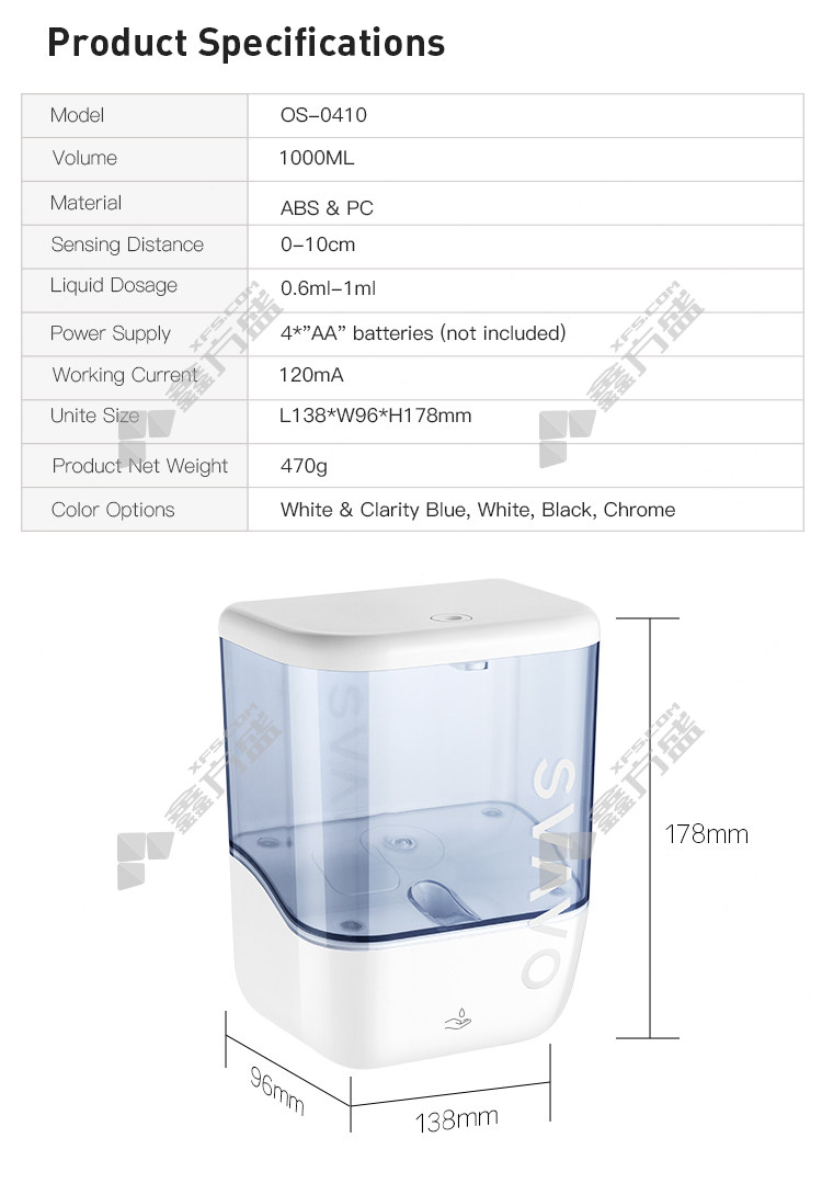 商品名称: 瑞沃 感应皂液器OS-0410 OS-0410黑 感距10cm 1L L178.5*W138*H96.2mm