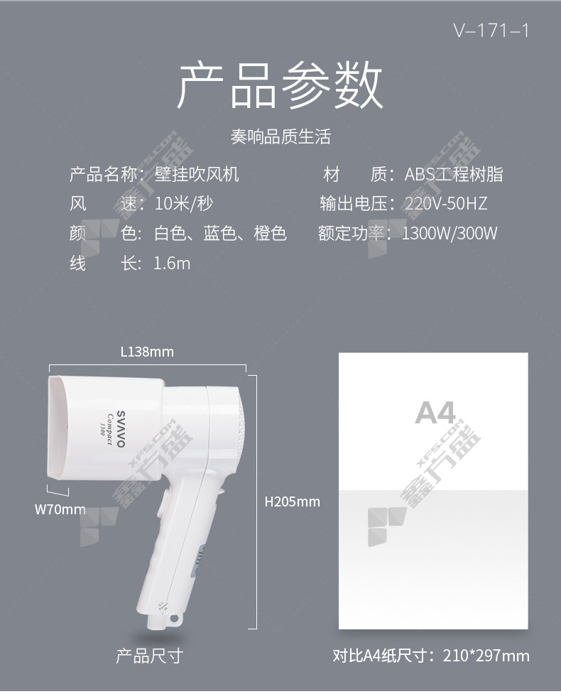商品名称: 瑞沃 吹风机V-171-1 V-171-1白色 风速:10m/s L205*W106*H170mm