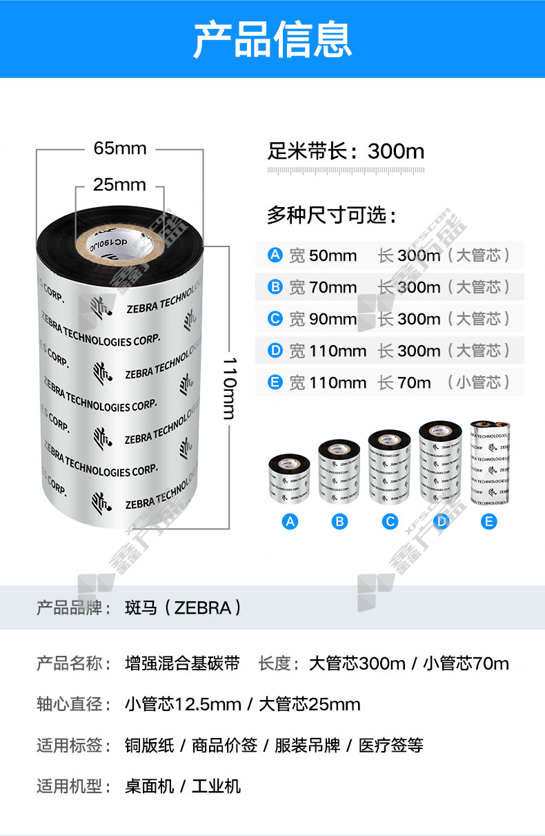 商品名称: 斑马 混合基碳带 25mm管芯 110mm×300m 黑色 通用 黑色 110mm*300m
