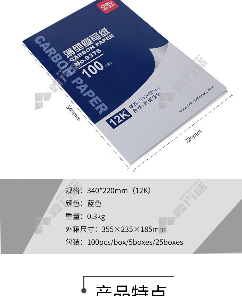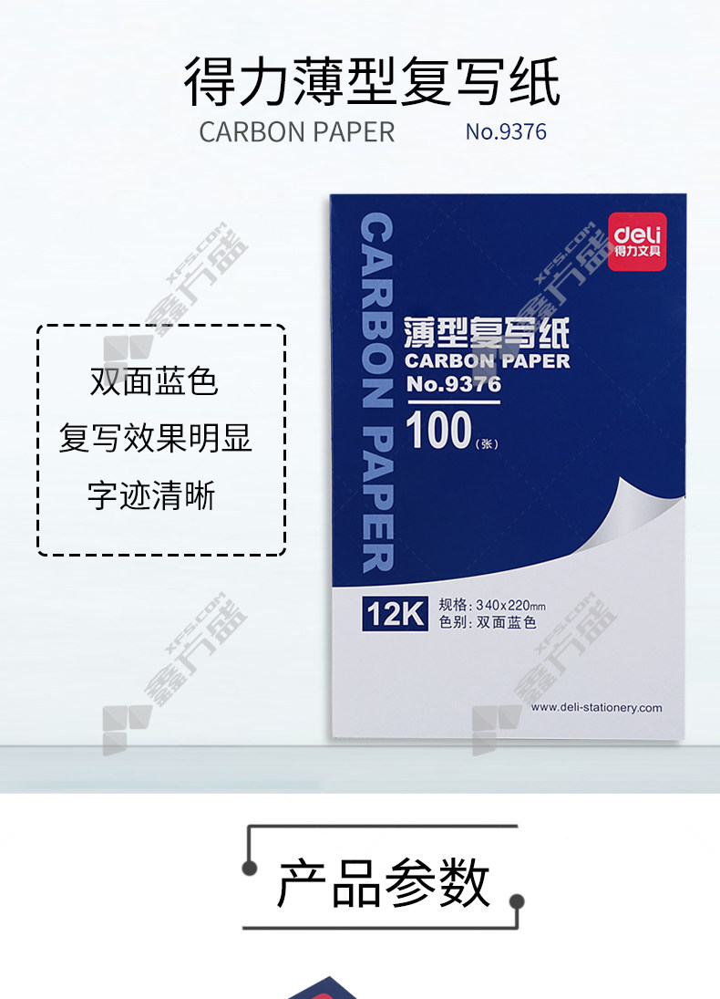 商品名称: 得力 9376 薄型复写纸 12K 340*220mm 100页 9376