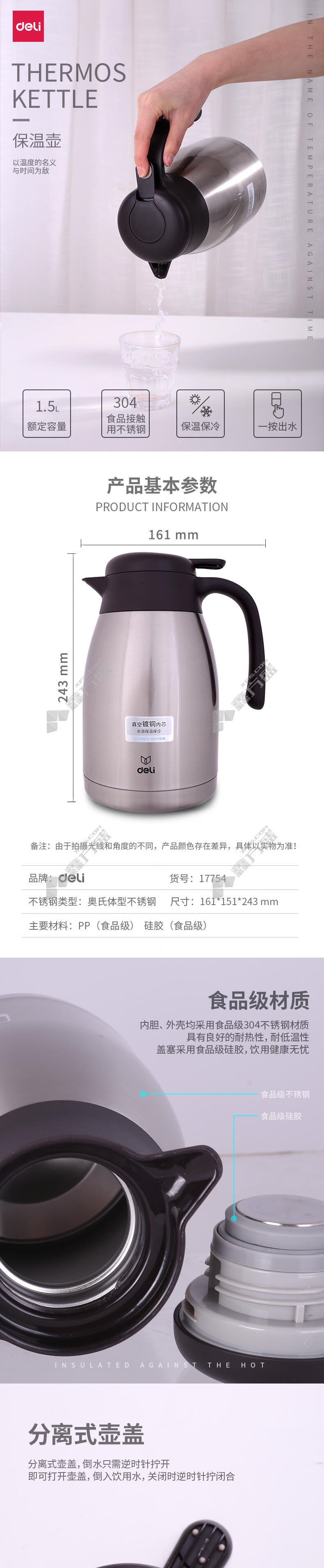 商品名称: 得力 17754不锈钢真空保温壶 1.5L 17754
