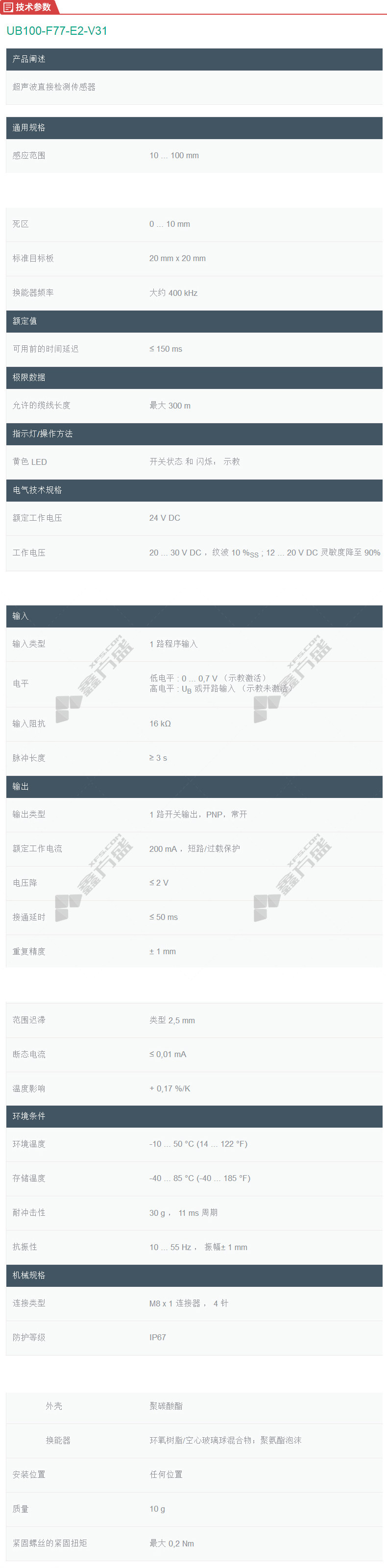 商品名称: 倍加福PEPPERL+FUCHS 漫反射和反射板式传感器UB100系列 UB100-F77-E2-V31