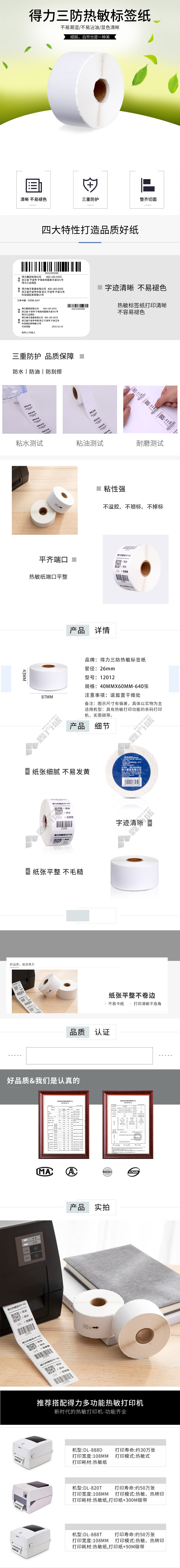商品名称: 得力 12012 三防热敏标签纸 4640张 40*60mm 白色 12012