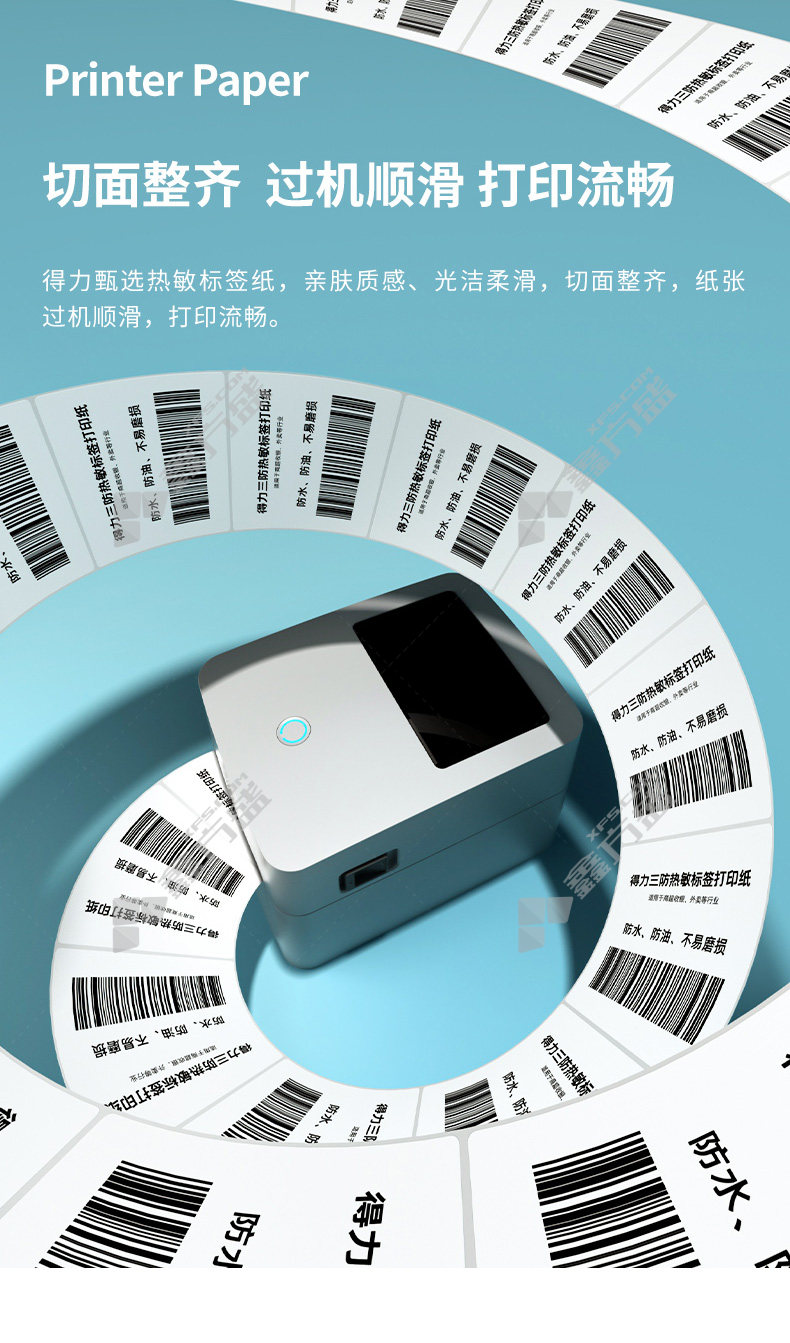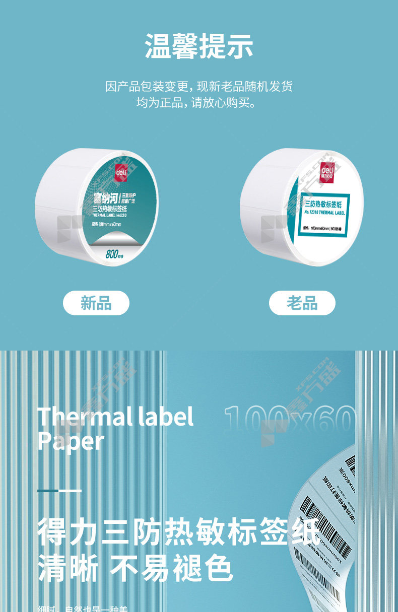 商品名称: 得力 12310 热敏标签纸 适配100mm及以上打印尺寸热敏打印机 单排 100*60mm 800张 白色