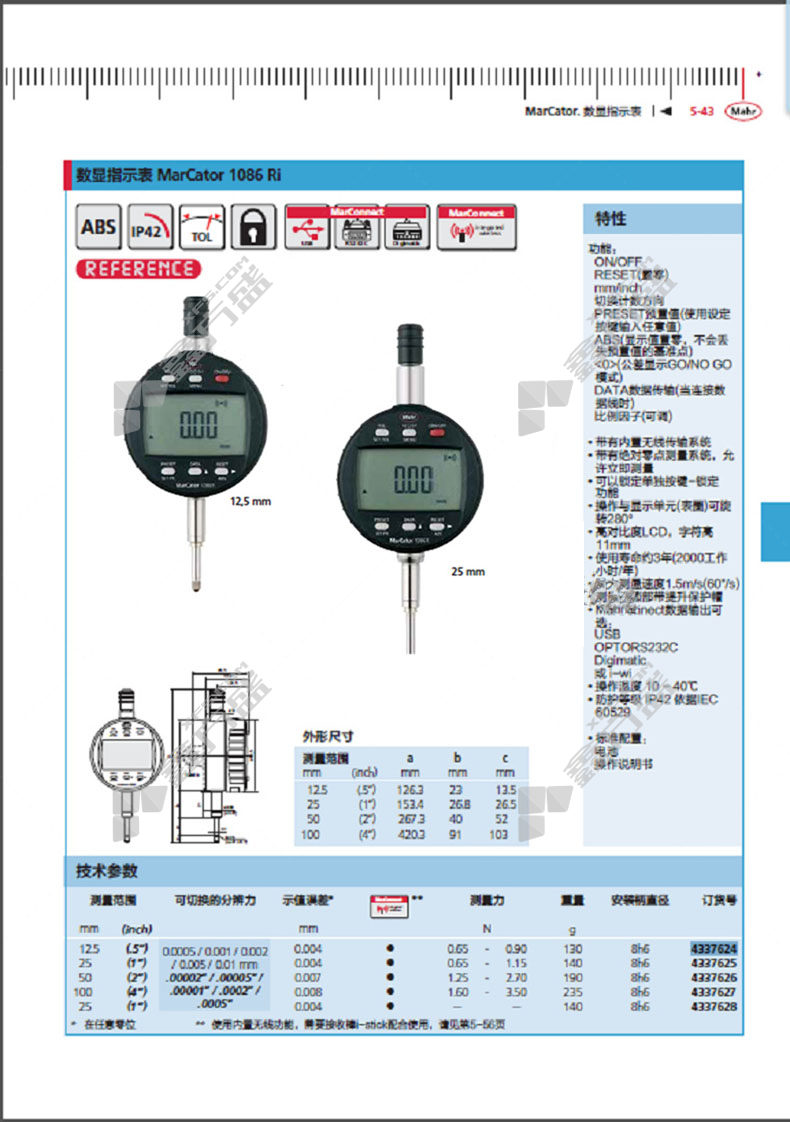 马尔 数显无线千分表 REFERENCE系统 无弹簧型 0,0005/25 4337628
