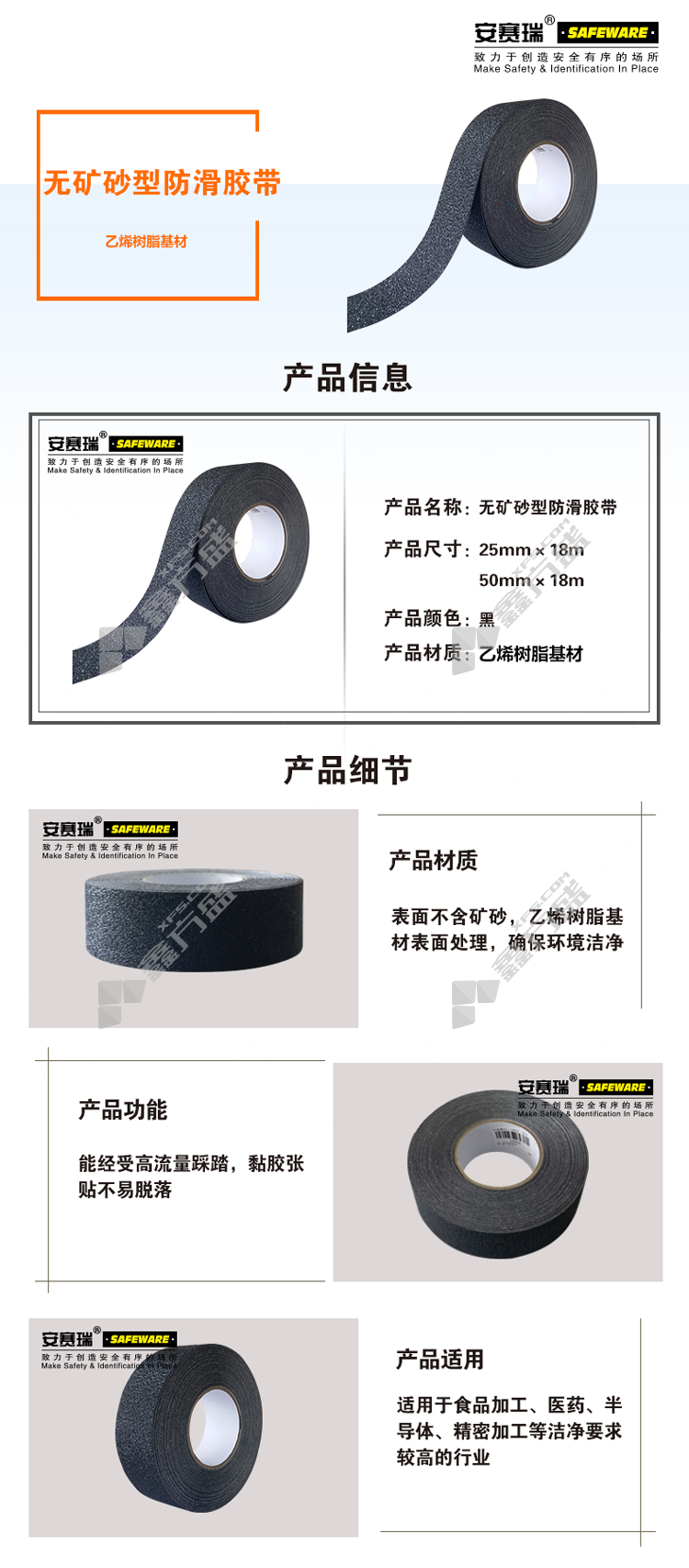 商品名称: 安赛瑞 14453 无矿砂型防滑胶带 黑色 2.5cm*18m