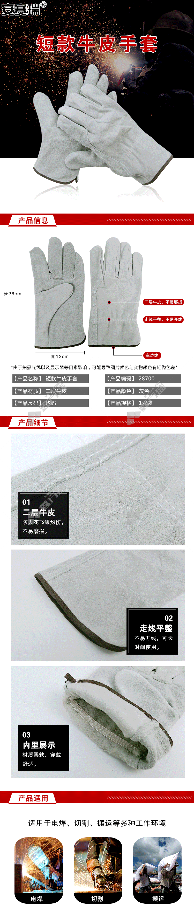 商品名称: 安赛瑞 28700 短款牛皮手套 均码 26cm 灰色 28700