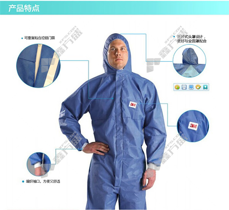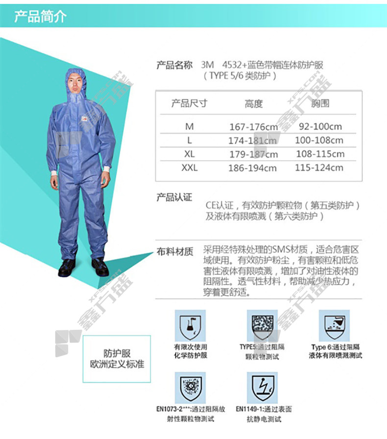 商品名称: 3M 4532 带帽连体防护服 XL 蓝色 带帽连体