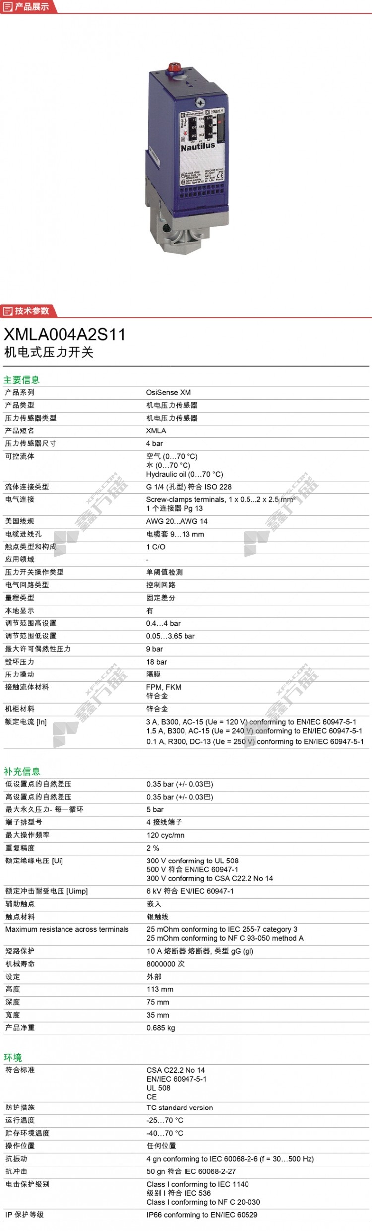 商品名称: 特勒美科 压力传感器 XMLA004A2S11