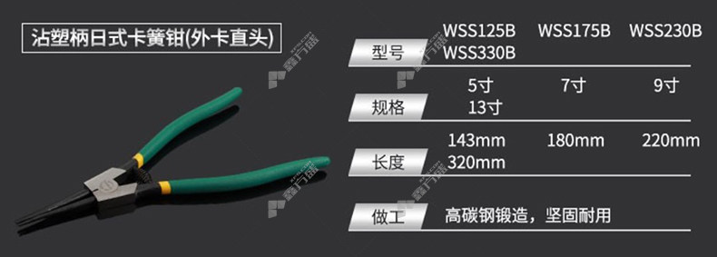 商品名称: 威力狮粘塑柄卡簧钳 外卡直头 WSS230B 9寸