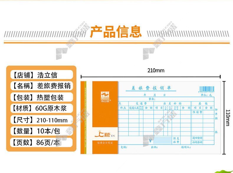 商品名称: 浩立信 聚橙系列 35K-差旅费报销单(1943 86页 210*110mm 1943