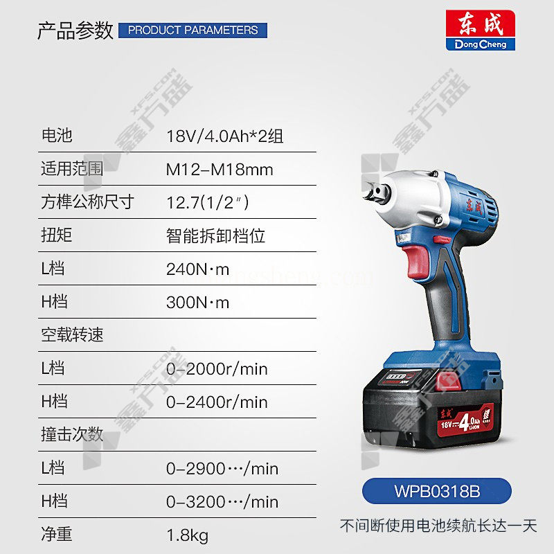 商品名称: 东成 无刷电动扳手木工锂电冲击扳手 WPB0318B 18V 4.0Ah L档:240N.m H档:300N.m