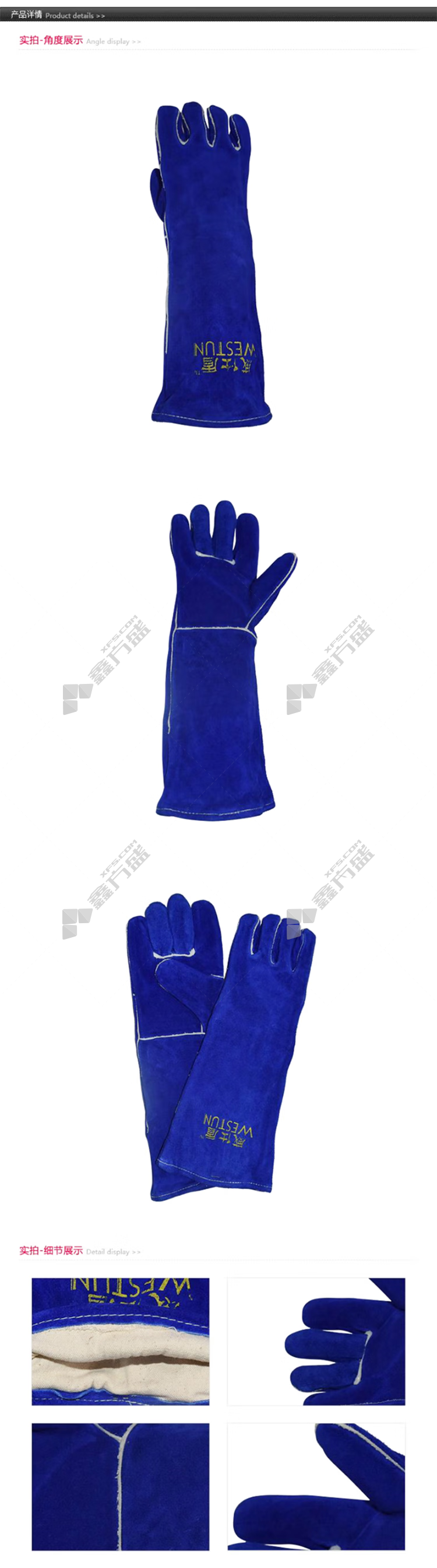 商品名称: 威仕盾 G-2054 牛二层皮防火线加长电焊手套 XL 45cm 彩蓝色