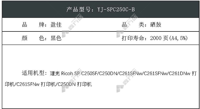 商品名称: 盈佳 RC-SPC250C型(打印碳粉盒) 黑鼓 黑色 YJ-SPC250C-B 2000页(A4,5%)