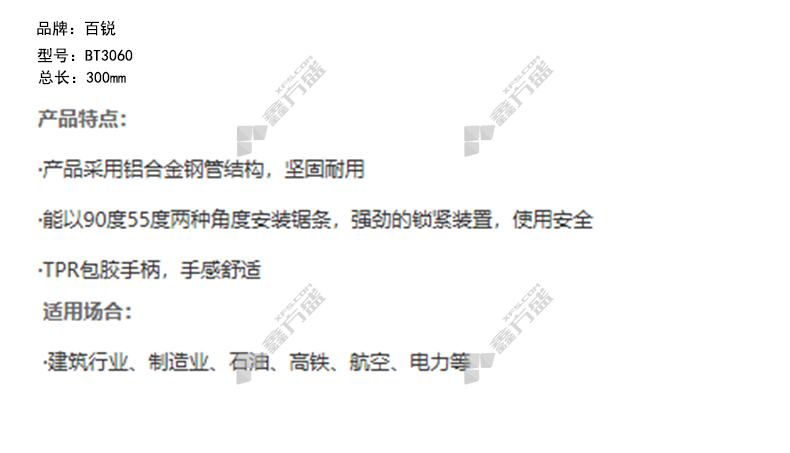 商品名称: 百锐 方管柄钢锯架铝合金 BT3060 300mm