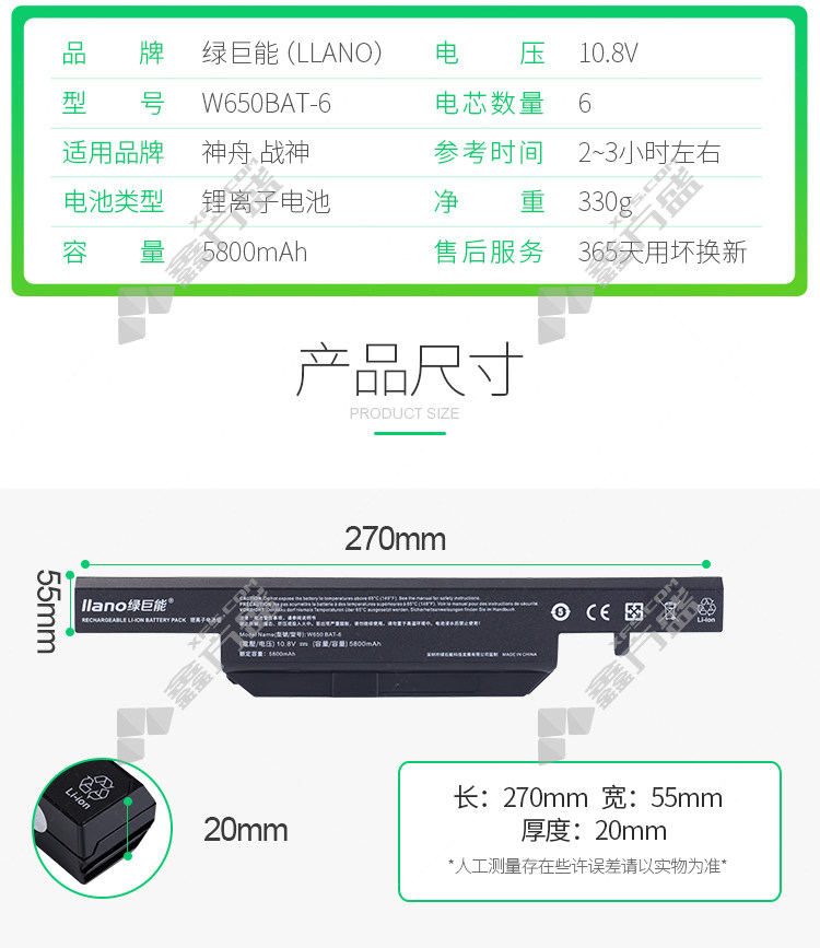 商品名称: 绿巨能 W650BAT-6 神舟战神K610C笔记本电池 W650BAT-6 5800mAh