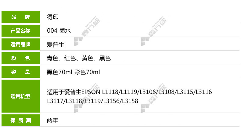 商品名称: 得印 004系列墨仓式四色墨水套装 青色/红色/黄色/黑色 适用爱普生L1118 1119 3108 3118 3119