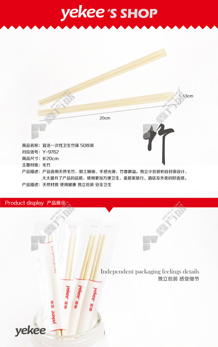 商品名称: 宜洁 Y-9762 一次性卫生竹筷 200x5.0mm 50双装