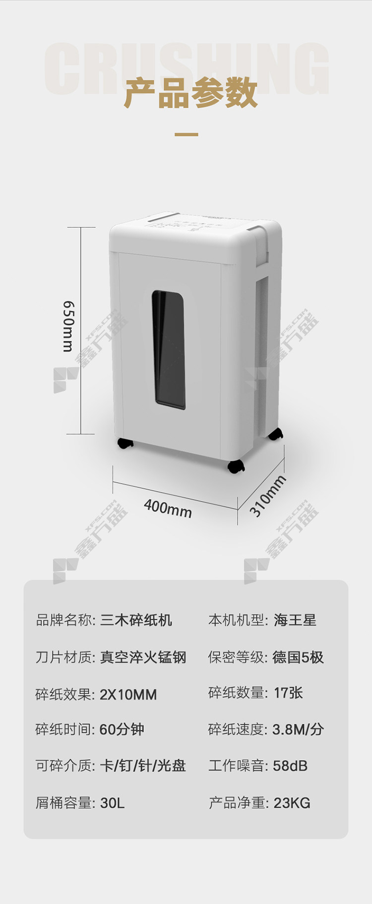 商品名称: 三木 海王星 锰钢侠系列碎纸机 浅灰 海王星 30L 5级保密机