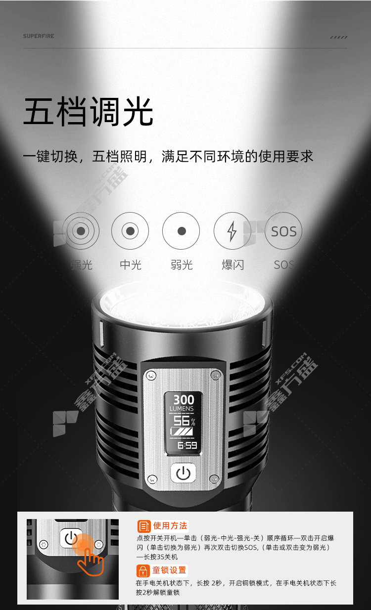 神火 M5 2600mah 中型强光手电筒 36W IP65 6档 M5