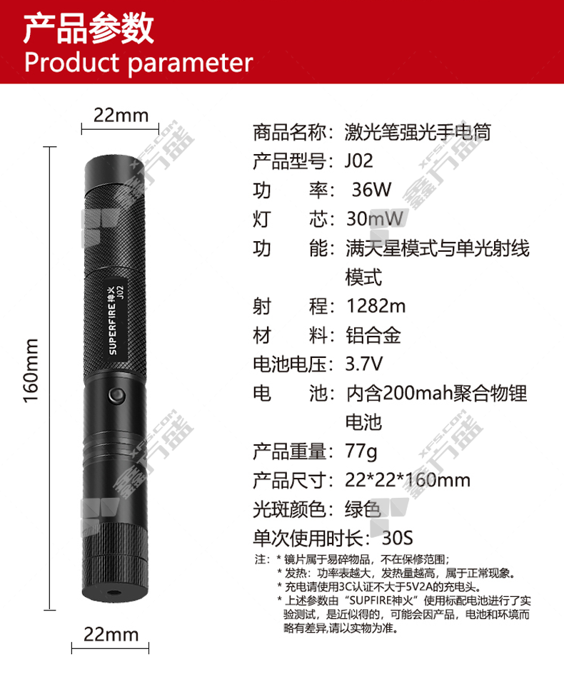 商品名称: 神火 J02 绿光 200mah 激光笔 36W 不防水 满天星模式+单线模式 J02