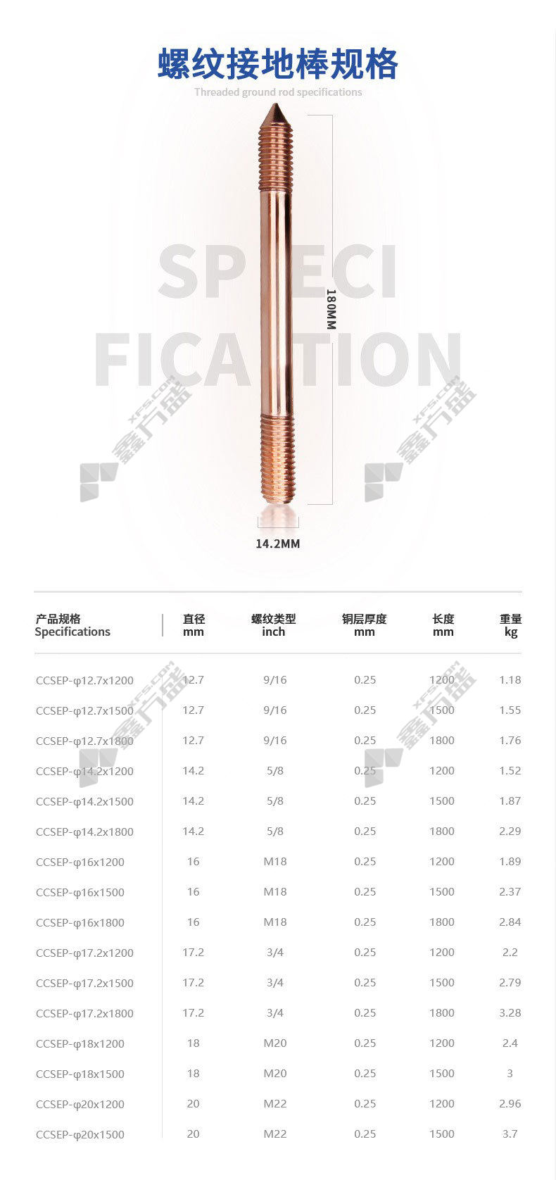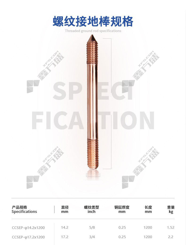 商品名称: 螺纹型镀铜接地棒 B级 14.2mm*1200mm