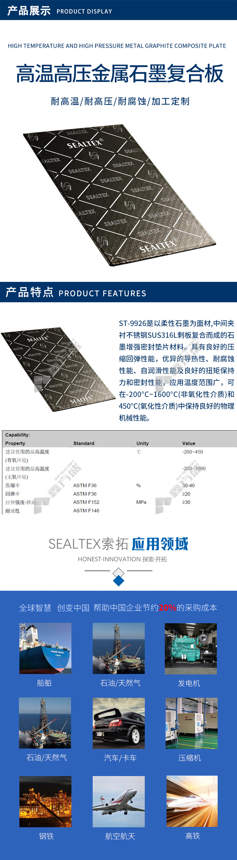 首页 首页 > SEALTEX/索拓 9926金属增强耐高温膨胀石墨复合板 1500×1500×1.5mm 1张